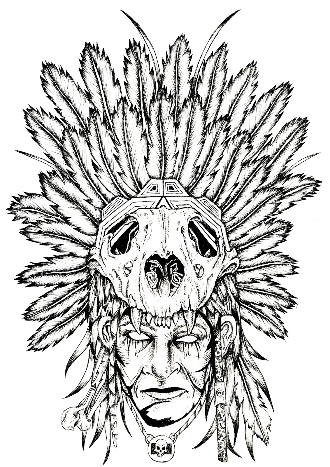 I have finished drawing my skull shaman positive. I think of all the shamans I have created for this project so far, This is my favourite as it is just as a drawing, but I will have to wait and see what sort of prints I get out of it before I can make full judgement. This shaman is wearing the skull of a jaguar so this is still technically a Mayan shaman, I just wanted to add in some new features to the print. The bene and the deadlock for example are subtle features I have included to get a more separate design from my last prints. I don't want them to all look too similar. Both separate and full colour blends will be explored with this design to make it a sellable print and to transfer onto some products.